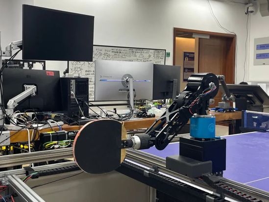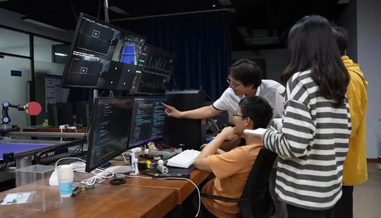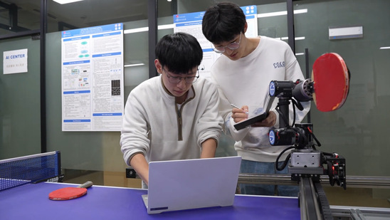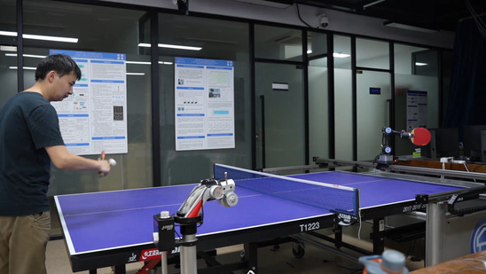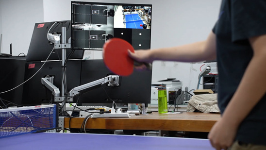 我们依靠多处安置的相机识别球并拍摄图像,通过球前面一小段的运动,我们建立一个模型,预测它整体的运动轨迹,找一个最合适小丘去打球的点,控制它用我们想要的速度和加速在指定时间到达那个点上面,它就把球打过去了。它打到一个球,系统里设计的得分比较高,它就会记录下这个球是怎么打的,下一次遇到类似情况就用同样的方式打过去。如果某一个球的处理系统得分较低,它以后就会避免。”
