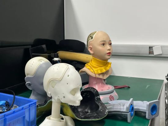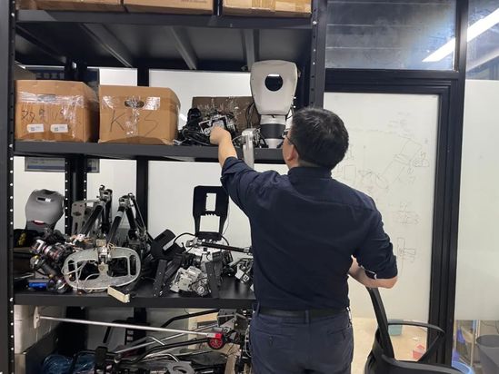 李清都:“我自己研究人形机器人18年,光实体就研究了10年,虽然这个是小贝4.0版本,但其实前面我们做了不下20款机器人了,你看这个架子上都是机器人的‘尸体'。