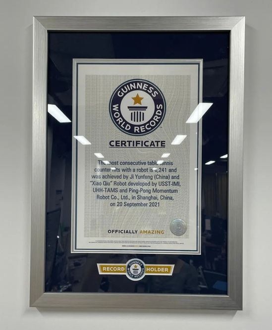 墙上的吉尼斯证书显示,眼前这台名叫“小丘”的乒乓球智能机器人,2年前就和季云峰联手,用连续6241回合的对打成绩创造了乒乓球人机对战的世界纪录!