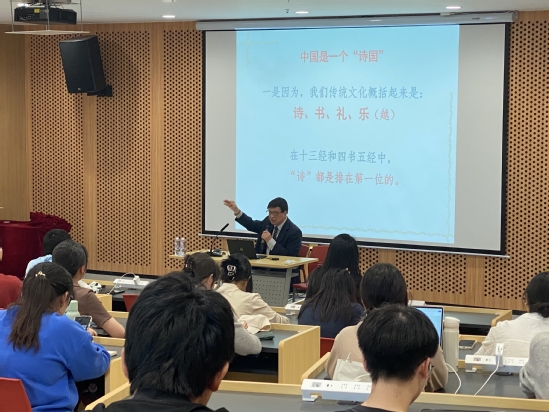 作为中国《文心雕龙》学会副会长、上海市文史研究馆馆员、文史馆诗词研究社社长,曹旭教授在中国古代文艺理论、古典文学方面造诣极深,以《诗品集注》《诗品研究》《中日韩诗品论文选评》系列享誉海内外。他以脍炙人口的唐诗代表作为切入点,从宏观上剖析了儒、释、道对唐诗的影响,品评了唐诗、宋诗的异同,并根据时间线梳理了初唐、盛唐、中唐、晚唐诗歌风格变迁;从微观上以文献考证的方式论证了中日韩课本中《静夜思》原文的异同,李白、杜甫在安史之乱时代大背景下的个人沉浮与诗风转变。此外,对于师生感兴趣的大数据下唐诗名家排名、“阳光大男孩”李白与“哲理沉思派”苏轼孰高孰低、大诗人的“铁杆粉丝”也是大诗人、《长恨歌》让杨贵妃一不小心去了日本等内容逐一进行专业解读。