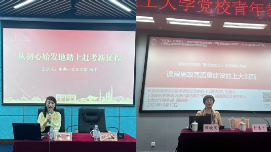 中共二十大代表、中共一大纪念馆宣教部主任杨宇以“从初心始发地踏上赶考新征程”为题,以其作为一线党史宣传者和党的二十大代表的亲历者,号召学员从党的历史中感受非凡伟力、从党的二十大精神实质中书写时代荣光、从新时代党的伟大成就中凝聚奋进力量。中国科学院院士、上海科技大学副校长席南华从数学史、数学的特性、数学的美、数学家、数学的浪漫等多个角度深刻阐释了数学的意义。上海大学教学部副主任顾晓英教授围绕“课程思政高质量建设的上大创新”,引导青年教师要把课程思政作为一项崇高的使命,将课程思政元素溶盐于汤,打造有温度有深度的课程思政。