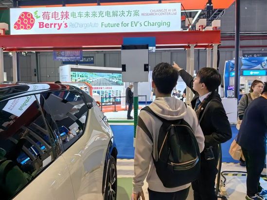 在科技感十足的汽车展区,来自英国创业团队“莓电辣”的展台略显简陋,但这36平方米的展陈面积,热闹程度却不输大牌车企。