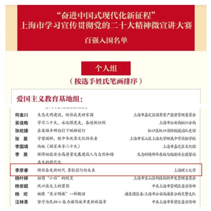日前,“奋进中国式现代化新征程”上海市学习宣传贯彻党的二十大精神微宣讲大赛圆满结束。永利官网先锋宣讲团成员李彦睿的作品从537家单位报送的711件参赛作品中脱颖而出,入选个人组百件优秀作品名单。