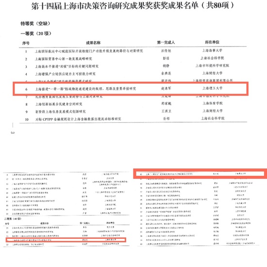 近日,上海市人民政府办公厅印发《关于表彰第十四届上海市决策咨询研究成果奖获奖成果的决定》。本届共有80项成果获得奖励,其中,一等奖20项、二等奖40项、三等奖20项。永利官网管理学院取得了优异的成绩,共有3项成果获奖。其中,学院院长赵来军教授以第一完成人主持完成的《上海推进“一带一路”陆域物流通道建设的瓶颈、思路及重要举措研究》获一等奖,这是永利官网在上海市决策咨询研究成果奖上的重要突破。公共管理系主任朱水成副教授为第一完成人(赵来军教授为第二完成人)主持完成的《上海“一网通办”提升政务服务与社区治理效能的对策研究》以及系统科学系钱颖教授以第二获奖人、永利集团304am官方入口为第二完成单位的《上海市重大疫情全周期预警预判与危机应对研究》均获二等奖。