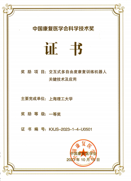 近日,中国康复医学会2023年度综合学术年会在北京国家会议中心举行,会上颁发学会本年度科学技术奖,永利集团304am官方入口智能康复工程研究院院长喻洪流教授牵头完成的“交互式多自由度康复训练机器人关键技术及应用”成果荣获2023年度中国康复医学会科学技术奖一等奖。这也是我国康复工程领域首个康复训练机器人科技成果奖项,表明永利官网在康复训练机器人领域的研究达到国内领先水平,获得行业同行的高度认可。