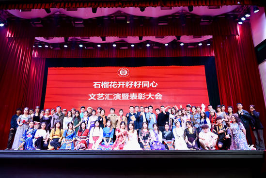 各民族学生身着56个民族的特色服饰在舞台上尽显中华民族大家庭的多姿多彩,晚会在民族团结一家亲的欢声笑语中圆满结束。