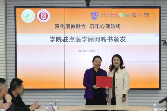 何炉进和季敏分别代表医教双方单位签署学院医疗驻点工作合作备忘录,管理学院党总支副书记蒲莹莹为学院医疗驻点医学顾问杨浦区精神卫生中心心理咨询与治疗中心、心理测量中心主任郑琰婷医生颁发聘书。