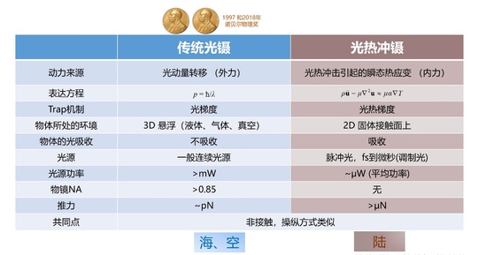 光热冲镊技术的发明使得激光操纵突破了界面阻力困境,补全了光操纵的应用环境,使得激光最终实现了可在堪比海陆空三界(真空/气体,液体及固体)的微纳环境中任意操控物体。在物理上,则聚焦了瞬态热弹性动力学和摩擦学,特别是非破坏性研究,这进一步揭示微观领域机械动力过程的理解。该技术原理上可以用于任何波长范围和任何可吸收材料。此外,通过空间光调制和多机器人协作,可以实现自主纳米机器人集群,完成目前常规手段不能实现的复杂任务。