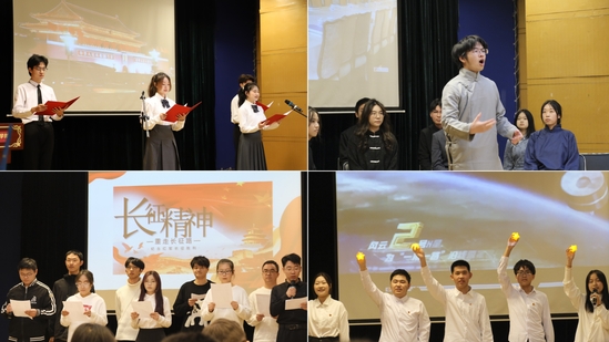 “河山统一!河山统一!”伴随着音乐和屏幕上播放的影像资料,台上学员的齐声呐喊赢得了台下阵阵掌声,学员以情景剧的形式,重现《建军大业》的精彩片段,展示出中国共产党在建军时期的气魄与毅力,弘扬伟大建党精神。