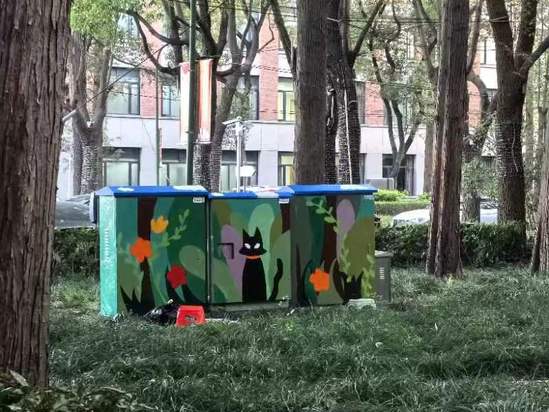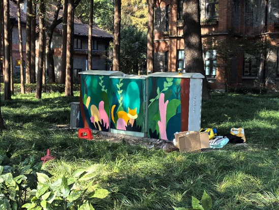 姚瑶与徐亦舒在11月还参与了校园“变电箱艺术绘画”改造,草坪里的变电箱从一片“灰白”箱面到一幅树林和猫咪的插画,为校园带来了温暖的色彩。