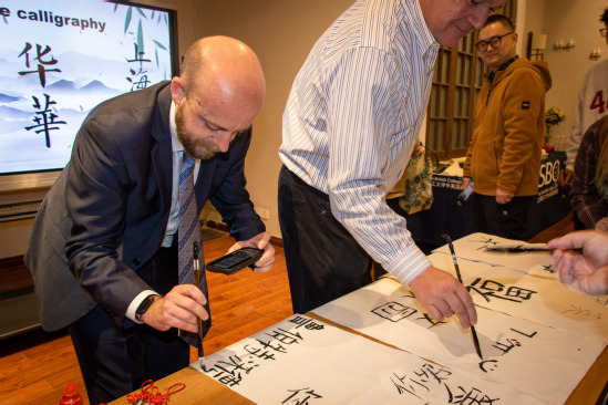 书法,一直是中华文化对外的一大名片。学生会国际项目部部员耐心示范标准的握笔姿势,通过笔墨的运用、字形的美感和布局的协调让大家理解并欣赏到文字的力量。大家纷纷走上前在宣纸上写下自己的名字与最真挚的祝福。一笔一画,用心描摹,在轻松愉快的氛围中互相展示作品。