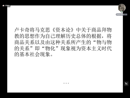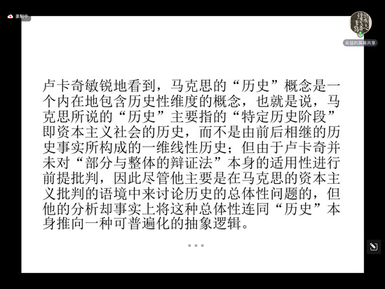 在本场讲座中,吴猛教授围绕卢卡奇“历史的总体性”思想的科学内涵及相关意义展开了精彩的演讲。一方面,吴猛教授指出总体性的批判意义并强调把总体性看作未来的理想状态,以总体性的人作为未来社会发展方向,实现人的解放与自由;另一方面,吴猛教授强调卢卡奇对于马克思历史概念的总体性特征的阐发,对于整个马克思主义研究来说意义深远。