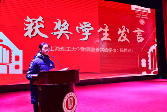 附属嘉善实验学校陈雨瑶代表获奖学生发言,她表示既要追寻五角星的星光,又要追寻上理之星的荣光,知不足而奋进,望远山而前行。附属杨浦少云中学曹瑛老师以《乘上理东风,绘教育梦想》为题代表获奖教师发言,她表达了感谢、感恩、感动之情,今后将更加饱满的热情勤勉工作、不负信任,为学生成长成才贡献力量。