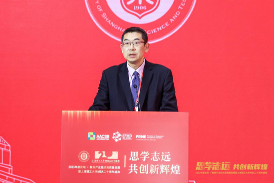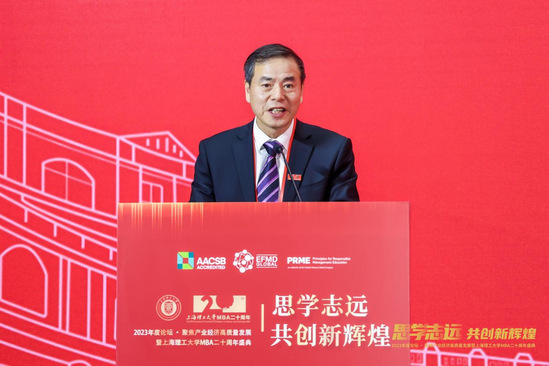 丁晓东在致辞中对各位嘉宾的到来表示热烈欢迎和由衷感谢,回顾了学校MBA办学20年来的发展历程和卓越成就,对管理学院通过AACSB等国际认证,“以认促建”所取得的成绩表示肯定。他指出,多年来,管理学院始终发扬“依托行业、产学研相结合”的办学传统,坚持“服务社会、造福人类”的办学宗旨,未来学校将不断加强MBA教育培养模式:一是优化课程设置,引进国际先进教学方法和手段;二是要借助优势学科,医工交叉和人工智能学科领域的发展,服务国家重大战略和产业转型升级;三是加强与企业的紧密合作,深化产教融合,持续推动上理MBA教育的高质量发展。