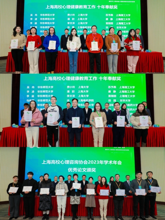 本届大会对在高校心理健康教育工作中长期坚守、努力工作、成绩突出的教师给予表彰,永利官网环境与建筑学院唐静、外语学院苏予燕、中德学院苗朋朋三位老师获得“上海高校心理健康教育十年奉献奖”。大会同时还评选了年度优秀学术论文10篇,校心理健康教育与咨询中心陈峰、杨颎等老师撰写的《数字音乐冥想对大学生焦虑与抑郁情绪的干预研究》获得年会征文优秀奖。