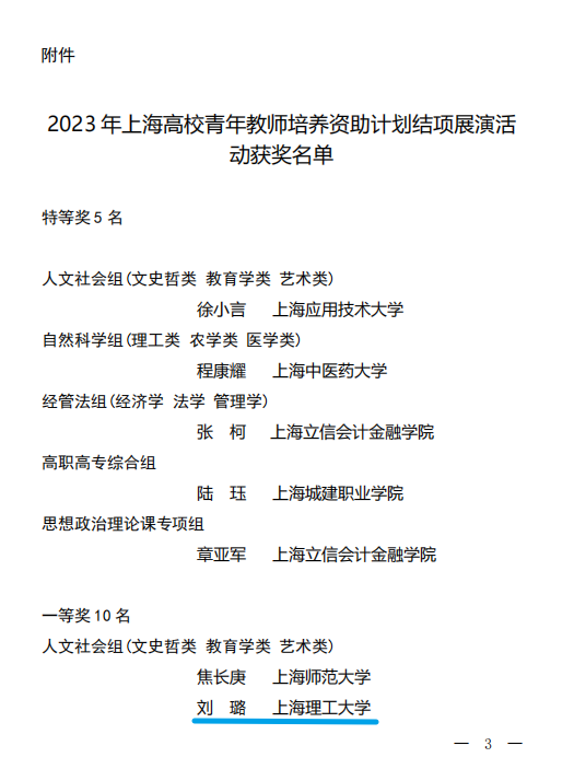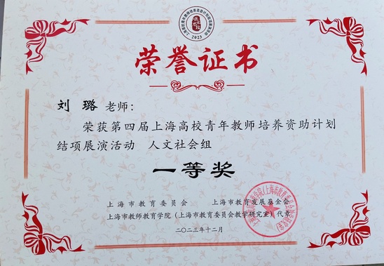 11月25日、26日,上海市教育委员会、上海市教育发展基金会举办了第四届“上海高校青年教师培养资助计划”结项展演活动,此次展演从2021年“上海高校青年教师培养资助计划”入选教师中遴选了75名优秀青年教师参加,活动设立人文社会、自然科学、经管法、高职高专、思想政治理论课五个展演组别,版艺学院教师刘璐获人文社会组一等奖。