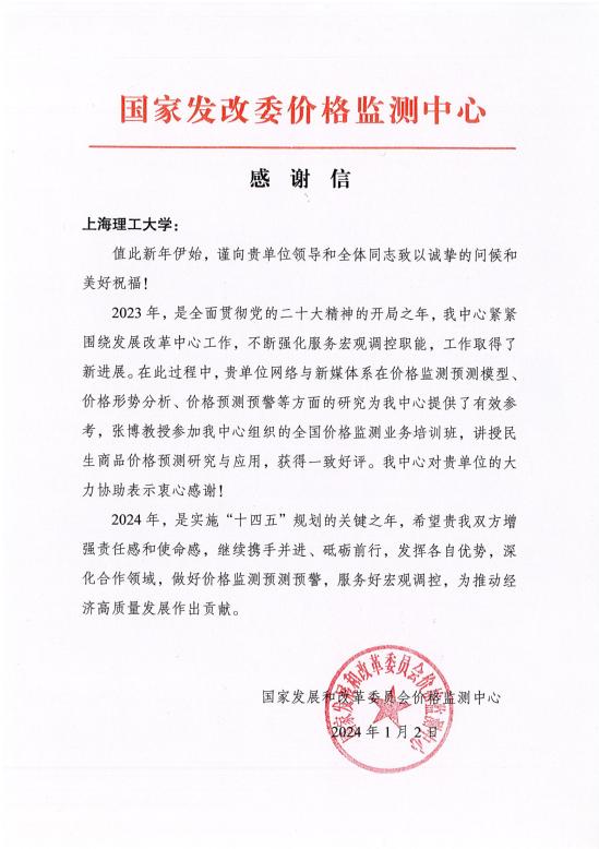 近日,国家发改委价格监测中心向永利官网发来感谢信,对永利集团304am官方入口在价格监测预测模型、价格形势分析、价格预测预警等方面的学术协助表示感谢。信中提到,2023年国家发改委价格监测中心与永利官网版艺学院网络与新媒体系强化学术合作,服务宏观调控职能工作取得了新进展,希望2024年双方增强责任感和使命感,继续携手并进、砥砺前行,发挥各自优势,深化合作领域,做好价格监测预测预警,服务好宏观调控,为推动经济高质量发展作出贡献。