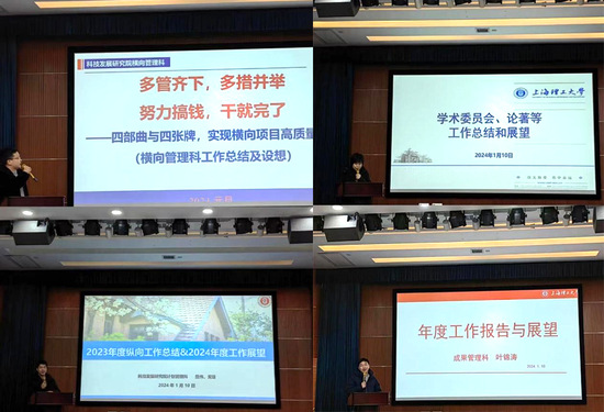各业务科室主管分别从科技政策制定、项目申报和立项、学科平台建设、论文发表和成果报奖、跨学科组织研究、质量与资质建设、期刊发展等方面总结汇报了2023年开展的重点和亮点工作。同时,结合各自业务工作,与会人员对如何更好地开展2024年科研管理工作进行了广泛讨论。