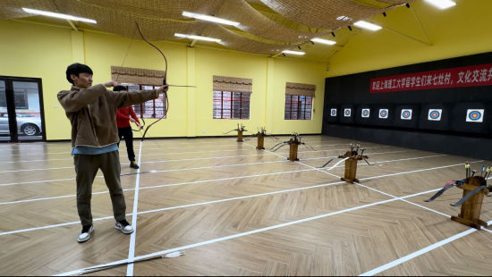 在射箭体验中,观看上海对外经贸大学同学的射礼演示后,国际学生们分成几组,进行海绵冷兵或攻防箭对抗。现场还有来自云南的少数民族同学们一起,其乐融融。