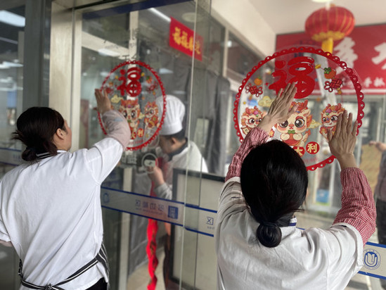 今年,学校将继续在除夕夜至正月初三,免费送上春节十餐,让留校师生品尝暖心又暖胃的别样团圆饭。年夜饭套餐里既有南方地区过年必备的传统家常菜全家福煲、腌笃鲜,寓意美好、香醇适口,又有独具西北风味的特色美味大盘鸡、手抓羊肉,满足留校师生的味蕾。这些天,食堂大厅布置了中国结、红灯笼、彩带和窗花年味儿十足。今年的宝山校区益新一层食堂还在进口处增加了新年合影点和心愿签名墙,每位前来用餐的师生都能在签名墙上许下最美好的龙年心愿,并约上三两好友合影留念。