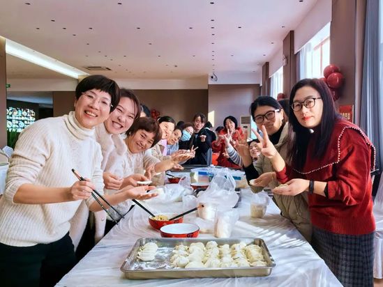 活动现场气氛欢快热烈,师生一起做游戏、吃饺子、话家常,夜幕下的廖凯原楼洋溢着过年的气息。
