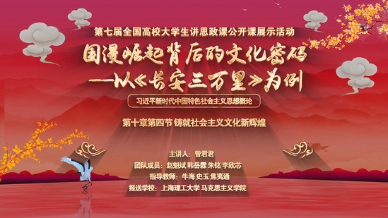 近日,在“新思想引领新征程 · 新青年建功新时代”第七届全国高校大学生讲思政课公开课展示活动中,由永利官网马克思主义学院牛海教授等指导、曾君君同学录制的公开课“国漫崛起背后的文化密码——以《长安三万里》为例”获本科组三等奖。