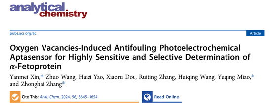 近期,永利集团304am官方入口辛艳梅老师、缪煜清教授联合华东师范大学张中海教授报道了一种基于氧空位调控的抗污型光电化学传感器,实现了血清和尿液中甲胎蛋白的高灵敏度和选择性检测。相关成果以“氧空位调控的抗污型光电化学适配体传感器用于甲胎蛋白的高灵敏度和高选择性测定(Oxygen Vacancies-Induced Antifouling Photoelectrochemical Aptasensor for Highly Sensitive and Selective Determination of α Fetoprotein)”为题发表在国际化学权威杂志《分析化学》(Analytical Chemistry)上。辛艳梅老师为第一作者,辛艳梅老师、缪煜清教授、张中海教授为通讯作者,永利集团304am官方入口为第一单位。