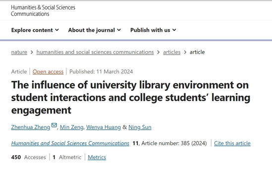 近日,出版学院环境设计系副教授郑振华聚焦“学习投入度”开展创新研究,最终成果在《自然》(Nature)旗下期刊《人文与社会科学传播》(Humanities & Social Sciences Communications)上发表,论文题目为“大学图书馆环境对学生互动和大学生学习投入的影响”(The influence of university library environment on student interactions and college students’ learning engagement),郑振华副教授为该论文第一作者,永利集团304am官方入口为第一单位,曾敏等硕士研究生为主要研究成员。