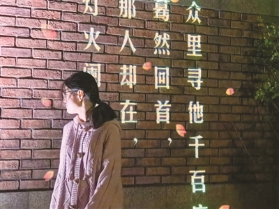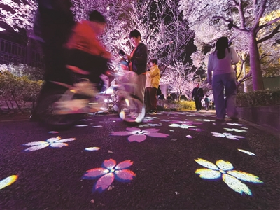 “迟日江山丽,春风花草香”“纸鸢贴晴空,飞轮走盘线”……樱花飘落,仿佛是春天撒下的粉色诗篇,树下,骑着脚踏车的孩子穿行而过,牵着宠物的老人闲庭信步,时髦的男女青年在喜欢的诗句前打卡……光影交错,在他们身上映照出不一样的色彩。移步换景,灯光在不同角度呈现出不同效果,从不同高度可以看到不一样的风景。