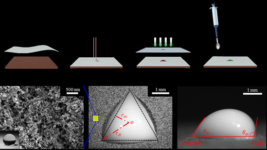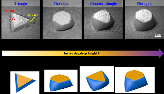 本文通过调控液滴凝固行为,首次实现了三维空间内的形状控制,并得出液滴三维无模成型的基本规律,将液滴形状调控从二维层面转向三维层面,为介微观三维结构的加工制造提供了一种全新方法。研究人员制备具有多边形的双浸润性表面,通过固定纳米流体液滴的接触线,在低温台上观察其凝固的过程,得到液滴高度和凝固后平台形状之间的变化规律。研究结果表明:三角形接触线固定的纳米流体液滴,凝固后平台形状随着高度的增加依次经历了三角形、六边形、反三角和六边形。理论计算和实验对比表明,复杂约束表面上的液滴可以被看作是具有不同接触半径的接触球,在给定液滴高度的情况下,会产生不同大小的顶部平台,这些尺寸的变化将决定凝固后最终顶部平台的形状。研究引入了形变因子,以两种机制描述随高度变化的颗粒堆积、界面流动和平台构造的作用传递机制。