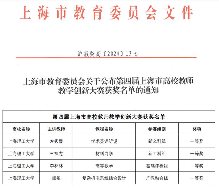 根据《上海市教育委员会关于公布第四届上海市高校教师教学创新大赛获奖名单的通知》(沪教委高[2024]13号),永利官网获得了4项一等奖的历史最佳成绩,学校同时获评“优秀组织奖”。