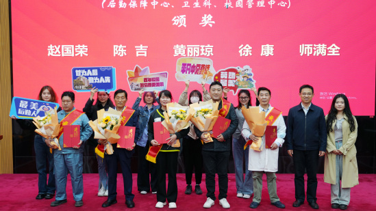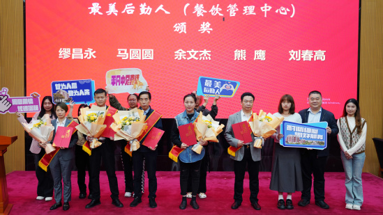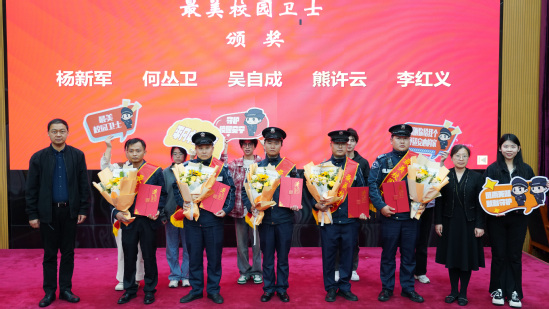 与会嘉宾为“最美后勤人”“最美校园卫士”获奖员工佩戴绶带、颁发获奖证书。