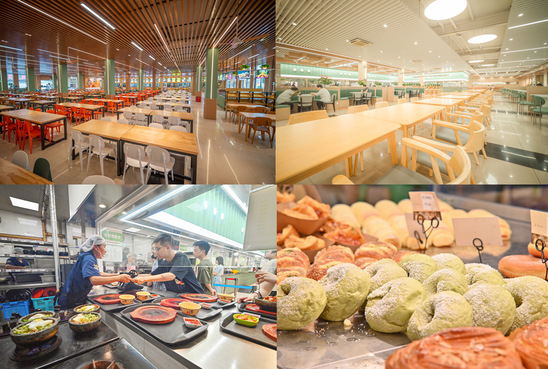 后勤党支部心系师生,解决南北校区餐饮环境不平衡问题,通过改造五食堂周边整体环境,打造了集休闲、活动、交流为一体的室内外空间。步入式沉浸花园、绿意盎然的主干道与五食堂门口休闲餐饮区相呼应,师生在此或进餐、或小憩、或学习交流、或开展社团活动,可静可动,美食美景总相宜。