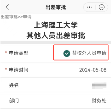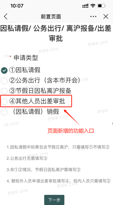 在“因私请假”销假前新增了“④其他人员出差审批”的入口,老师如果帮校外人员申请,可通此项进行操作。原“其他人员出差审批”单独入口已撤销。