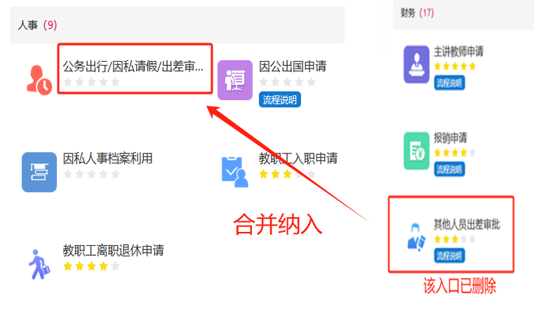 将“其他人员出差审批”功能整合至“公务出行/因私请假/出差审批”模块中。