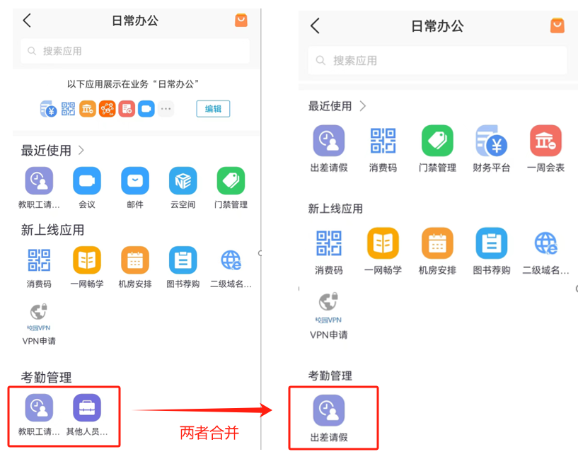 为更直观地体现模块功能,将电脑端信息门户原有的“因私请假/公务出行/离沪报备”模块名称变更为“公务出行/因私请假/出差审批”;手机端Welink因只能显示前四个字,名称变更为“出差请假”。(虽名称有不同,但此模块在信息门户和Welink上功能完全一样。)