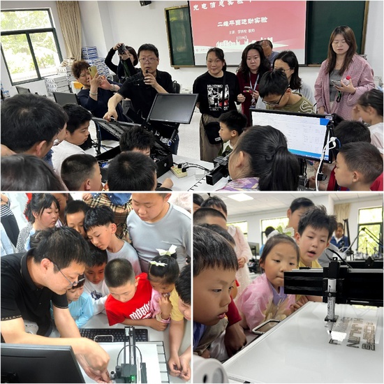 讲座结束后,在光电信息实验中心教师志愿者的引导下,大家有序地参观了本科实验教学中心,并在李铁栓教师的指导下进行了“二维平面运动实验”。在这个实验中,小朋友们通过电脑编程,控制记号笔在平板上自由书写,体验了科技给生活带来的便利与乐趣。