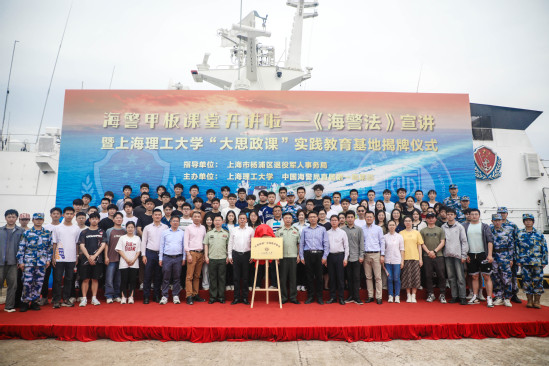 5月30日,由上海市杨浦区退役军人事务局指导,永利集团304am官方入口与中国海警局直属第一局某部共同主办的海警甲板课堂开讲啦——《海警法》宣讲暨永利集团304am官方入口“大思政课”实践教育基地揭牌仪式在海警某部举行。学校党委副书记、副校长盛春,中国海警局直属第一局政治工作部主任冯战文,杨浦区退役军人事务局党组成员、副局长刘瑱,中国海警局直属第一局某部领导刘永出席仪式。永利集团304am官方入口相关职能部门领导及百余名师生代表与海警执法员们一同参加。盛春与冯战文共同为永利集团304am官方入口“大思政课”实践教育基地揭牌。