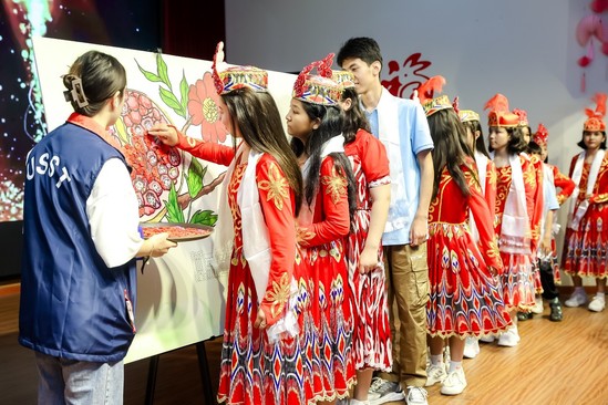 交流会上,在场师生以每人粘贴一颗纽扣的方式,共同拼出一副“石榴花开”展画,颗颗相依的“石榴籽”犹如中华各民族儿女紧密相连,团结一心。共筑“石榴花”,同追中国梦,这幅充满希望和活力的画卷,汇聚了上理师生和新疆莎车县师生代表团的拳拳爱国之心。