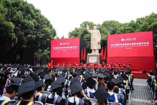 校园为礼堂,大道设坐席,今年上理工仍将最美的百年校园布置为毕业典礼的场所,为8000余位毕业生和家长代表留下校园印记。学校还通过微信视频号、抖音、B站三个平台进行直播,让无法亲临典礼现场的学生家长也能“云观礼”。据统计,共计18.3万人次通过线上直播观看毕业典礼,图片直播点击率约267万人次,点赞超28万次。