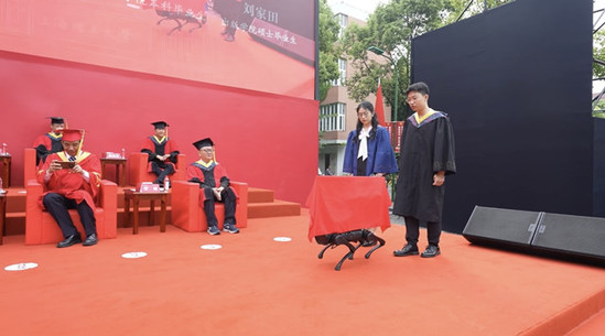 在今年的永利集团304am官方入口毕业典礼红毯上,一只萌萌的机械狗迈动着矫健的四肢机械腿,将两只灵动的仿生机械蝴蝶送到了毕业典礼的现场。这是2024届上理学子向母校赠送的特殊礼物——飞翼智蝶。毕业生们以机械仿生蝴蝶祝愿母校硕果累累育栋梁,桃李满天扬四海,也希望借展翅高飞的“凤蝶”,展现上理学子奋发向上、科技创新的决心。