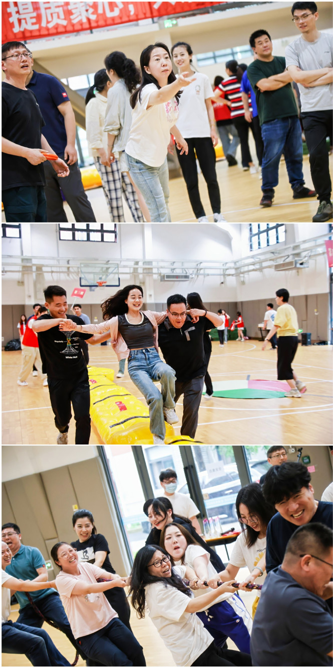 孙跃东、盛春、各职能部门负责人共同鸣笛宣布素质拓展活动正式开始。本次素质拓展活动共有150余名教师组成6支代表队,设置了集趣味性和竞技性为一体的6个竞赛项目,既有团队合作的趣味拔河、万众一心、勇往直前、水果连连看等集体项目,也有大家喜闻乐见的趣味沙盘等适合发挥特长的个人对抗赛,赛事还特邀国家一级运动员、国际田联一级教练员、永利官网高水平田径队教练员,来自体育教学部的仇周亮老师带领大家进行了充分的赛前热身。