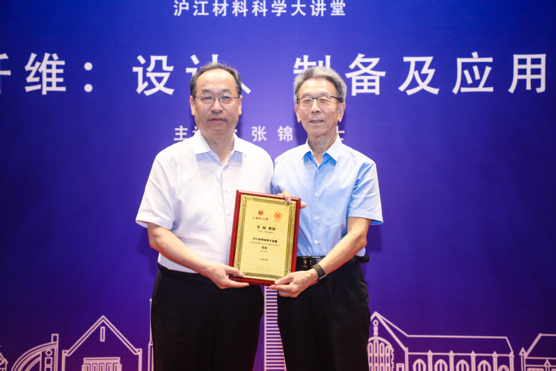 讲座结束后,窦世学院士向张锦院士颁发“沪江材料科学大讲堂”纪念牌。