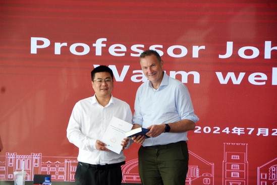 出版学院院长蔡锦达为约翰·东尼教授颁发聘书,正式聘任其为数字文明研究院首席教授。蔡锦达在致辞中介绍了出版学院的科研成果、专业设置和发展情况。他表示东尼教授此次访沪将为出版学院带来更加丰富的学术资源和国际化视野,期待与拉夫堡大学在教学、研究、人才培养等多方面展开更深入的合作。