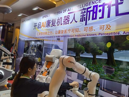 在活动展示区域,不时可以看到工作人员身着充满未来感的“外骨骼”。大艾机器人的外骨骼机器人产品已应用至全国的200-300家医院,每台机器每天可帮助约16位病人进行康复训练,大大提升了康复效率。