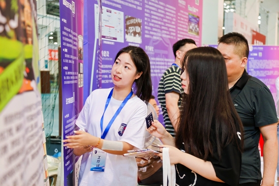 两对双胞胎同学在专业展台前与学院老师交流
