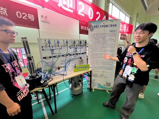 “气泵产生压缩空气,气体分流出来输入机械臂,机械臂采用气动控制,根据仿生学原理制作成人工肌肉,可收缩膨胀、任意弯曲,不仅可以实现更安全的人机协同作业,也可以在深海中作业,实现安全、清洁、环保的目标。”机械工程学院的两位学生在展台前,将他们自主研发的“气动柔性机械臂”介绍给新生们,不时还有感兴趣的学生上去操作,直观感知这个有趣的科研成果。机械工程学院党委副书记韦彪希望通过这样的方式,给新生们展示学院里学生们的科创项目和科研方向,让新生们第一时间对专业有更清晰的认知。“这就相当于开了一场专业推介会,我们将学院的好产品带来现场,让新生们在刚入学的时候,就能第一时间感知未来的专业方向,以及一系列智能制造的成果,学生可以动手演示,家长们也能参与其中,更好地了解智能制造。”