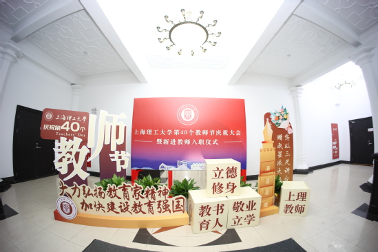 湛恩大道和勤勉大道两旁的道旗上展示着学校40位教师代表及从教感言,学校第40个教师节庆祝大会现场的拍照打卡区、互动体验区,该设计的视觉延展部分遍布在上理校园的各个角落,营造了尊师重教的浓厚氛围。