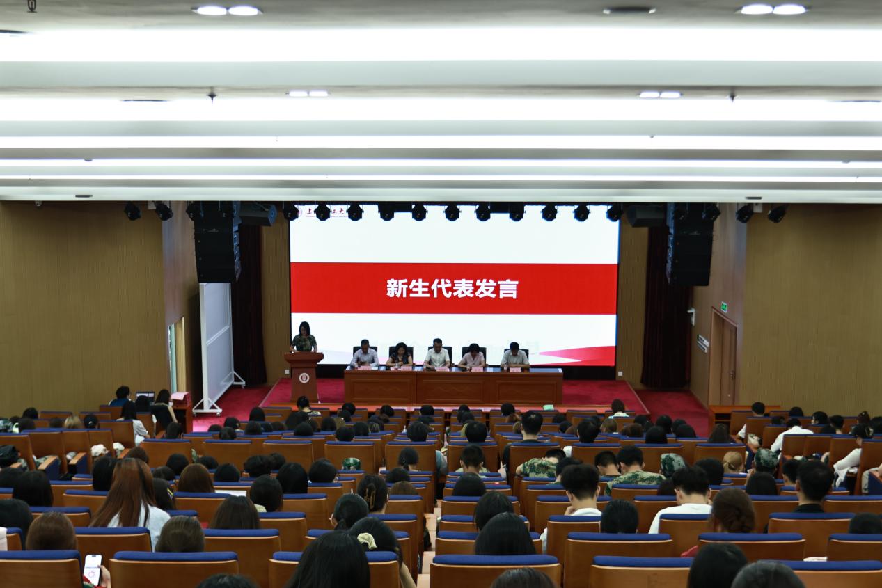 教师代表王晨老师以自身经历为例,分享了教学心得与人生感悟,激励新生们勇于面对人机深度融合新时代所带来的挑战,坚定作为外语人的理想信念,树立明确目标,以“开盲盒”式的期待去探索新领域,尝试从知识的接受者转变为知识的创造。高年级学生代表孙文娟本研均就读于外院,分享了大学生活的点点滴滴,传递了宝贵的经验与建议。本科新生代表邓元妍和研究生新生代表康晓彤分别上台发言,表达了对未来学习生活的憧憬与期待,展现了外语学院学子积极向上、敢于追梦的精神风貌。