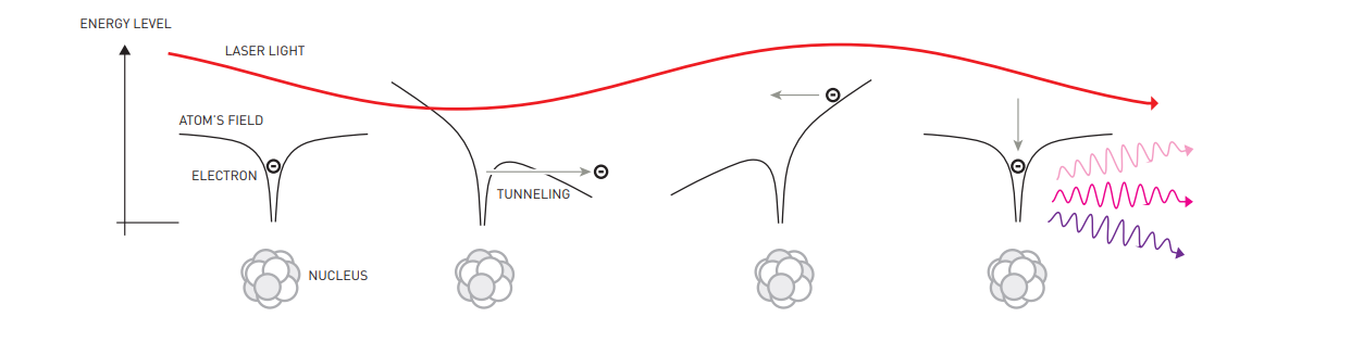 中国科学院物理研究所研究员魏志义等人2021年发表在中文学术期刊《物理》上的一篇论文表示,超快激光于20世纪80年代进入了飞秒激光时代。强场超快激光脉冲的一个重要用途是作为驱动光,通过高次谐波过程产生极紫外或更短波长的阿秒相干辐射。以气体高次谐波为例,当惰性气体与强场激光相互作用时,每个激光周期伴随产生两个阿秒脉冲。气体高次谐波的三步模型认为,激光场将首先使气体原子发生隧穿电离,释放出的光电子在电场的作用下运动,加速后的光电子最终与母体离子复合,使原子回到初始的量子态,多余的能量则以高能光子的形式释放,即高次谐波。